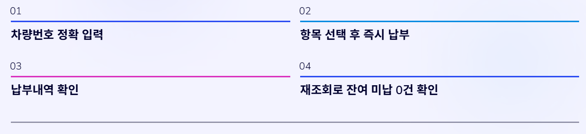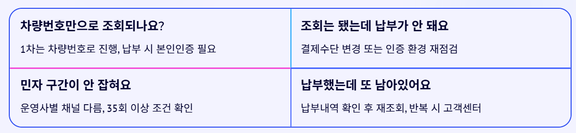 - Q. 차량번호만으로 조회가 되나요? A. 1차 확인은 차량번호로 진행되는 경우가 많고, 납부 단계에서 본인인증이 필요할 수 있습니다.