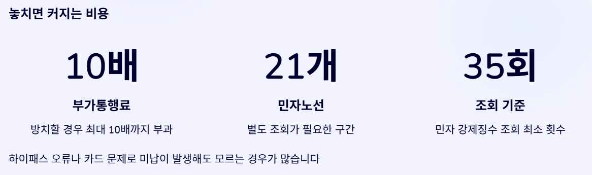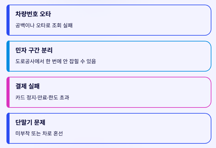 - 차로 혼선: 하이패스/일반 차로 혼선은 미납 처리로 이어질 수 있습니다.
