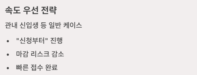 - 관점 A(속도 우선): 관내 신입생 등 일반 케이스는 “신청부터”가 유리(마감 리스크 감소)