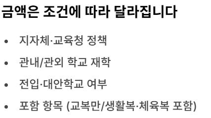 | 학교주관구매(현물) | 교복 1벌 제공(금액 표기가 없을 수 있음) | 학교 안내문/홈페이지에서 수령·치수·교환 규정 확인 |