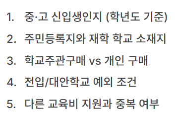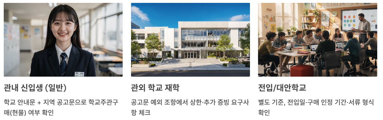 | 관내 신입생(일반) | 학교 안내문 + 지역 공고문 | 학교주관구매(현물)로 이미 제공되는지 |