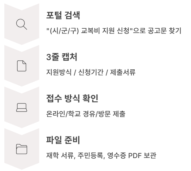 - 1) 포털 검색: “(시/군/구) 교복비 지원 신청” → 지자체/교육청 공고문 우선 열기