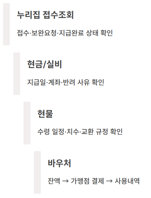 신청 후에는 보통 “접수 → 심사 → 지급(입금/충전/현물)” 흐름으로 진행됩니다. 여기서 가장 많이 놓치는 건 “지급완료” 표시만 보고 끝내는 것인데요, 실제로는 입금/포인트가 반영됐는지까지 확인해야 안전합니다.