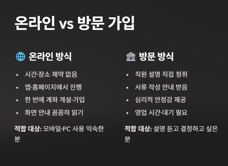 - 온라인 계좌 개설 시에는 본인 명의 휴대폰, 공동·간편 인증서, 영상통화 인증 등 비대면 본인확인 수단을 준비해 두면 좋습니다.