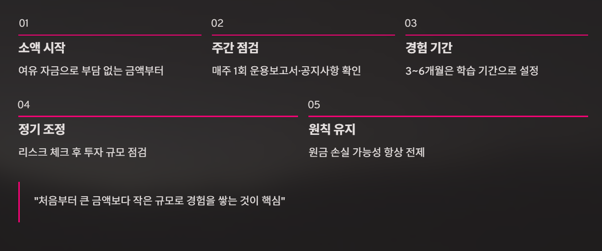 - 한 번에 큰 금액을 넣기보다는 자신의 경험·이해도에 맞춰 단계적으로 접근하는 것이 부담을 덜어 줍니다.