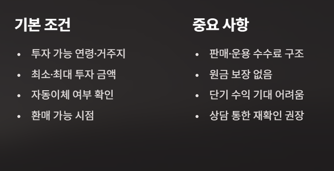 - 최소·최대 투자 금액, 자동이체 여부, 환매 가능 시점 등 자금 운용 계획과 연동되는 부분을 꼼꼼히 살펴봅니다.