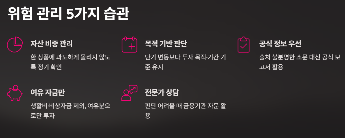 - ⑤ 투자 규모를 늘리더라도 “원금 손실 가능성”을 항상 전제로 하고, 단기 고수익 유혹에는 거리를 두는 것이 좋습니다.