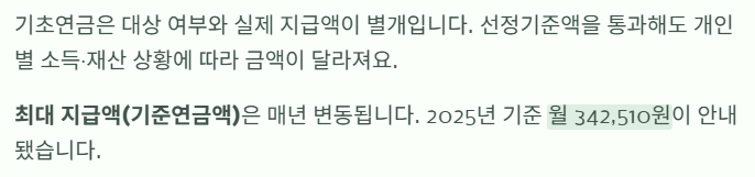| 최대 지급액(참고) | 매년 고시(예: 2025년 월 342,510원) | “최대로는 어느 정도?” 감 잡기 |