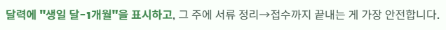 요약: 달력에 “생일 달-1개월”을 표시하고, 그 주에 서류 정리→접수까지 끝내는 게 가장 안전합니다.