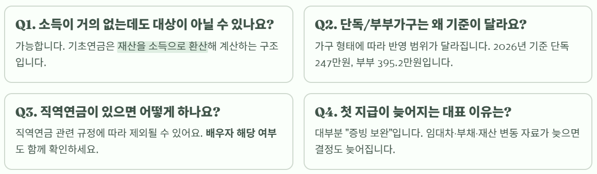 | 2026 선정기준액(부부) | 월 3,952,000원 이하(소득인정액) | 배우자 있으면 단독 기준으로 단정 금지 |
