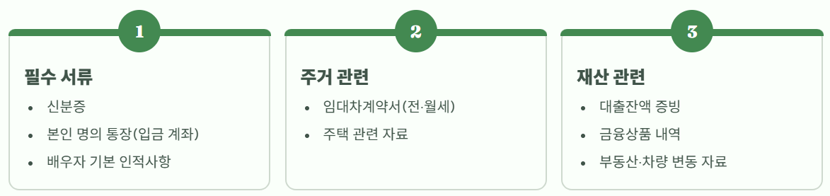 특히 최근 1~2년 사이에 주거 형태 변경(전세↔월세), 대출 실행/상환, 금융상품 해지가 있었다면, 그 자료가 심사 과정에서 꼭 필요해지는 경우가 많습니다. 해당된다면 “최근 변동 자료”부터 먼저 챙기세요.