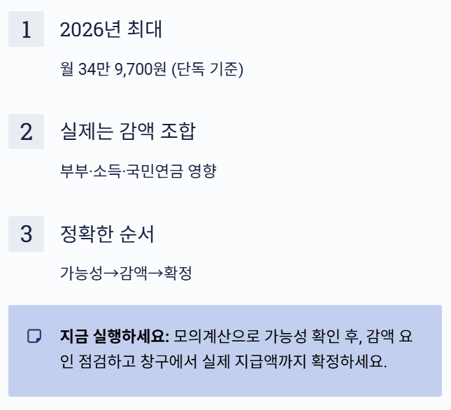 핵심 요약: (1) 2026년 최대는 월 34만 9,700원(단독 기준) (2) 실제는 감액 요인 조합으로 달라짐 (3) 조회는 “가능성→감액→확정” 순서가 가장 빠르고 정확합니다.
