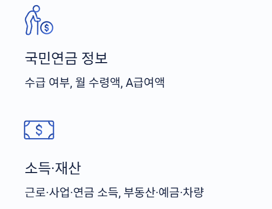 - 가구 소득(근로·사업·연금 등)과 재산(부동산·예금·차량 등)