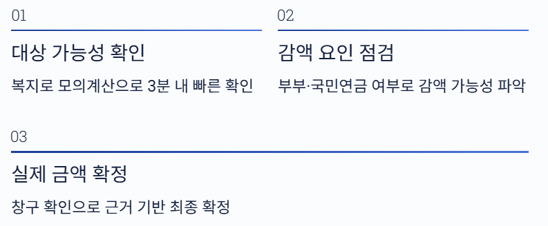 | 소득인정액 | 대상 여부 + 일부 감액 가능성 | 소득·재산 입력을 정확히(대충 입력하면 결과가 크게 흔들림) |