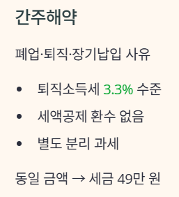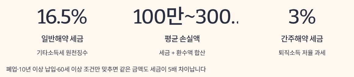 - 반대로 동일한 적립금이라도 사업은 그대로 유지하면서 단순 자금 사정으로 일반해약을 선택하면 세금 16.5%에 세액공제 환수까지 겹쳐, 실제 수령액이 400만~500만 원 가까이 줄어들 수 있습니다.
