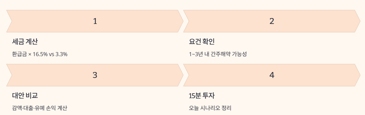 - 넷째, 오늘 안에 “내가 일반해약·간주해약 중 어디에 가까운지, 각각 세금이 얼마인지” 최소한 이 두 가지만 정리해 두고, 해지 시점은 이후 일정에 맞춰 결정하는 계획을 세웁니다.