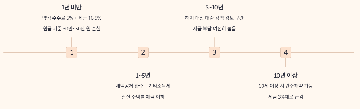 - 가입 1~5년 사이 일반해약 시: 수수료 부담은 줄어들지만, 그동안 받았던 소득·세액공제가 한꺼번에 환수되고 기타소득세 16.5%까지 적용되어 실질 수익률이 예금보다 크게 떨어지는 구간입니다.
