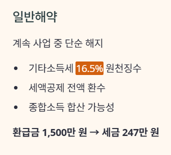 - 일반해약: 계속 사업 중인 가입자가 단순 자금 사정 등으로 해지하는 경우로, 해약환급금 전액이 기타소득으로 잡혀 16.5% 세금이 원천징수되고 세액공제도 환수되는 가장 손해가 큰 유형입니다.