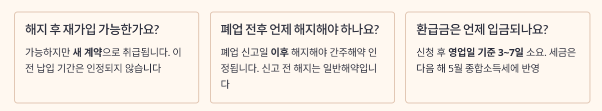 먼저 내 상황이 일반해약인지, 조금만 기다리면 폐업·장기 납입·60세 이상 등 간주해약 요건을 맞출 수 있는지부터 확인한 뒤 나머지 서류와 절차를 보는 편이, 세금 손해를 줄이는 데 훨씬 유리합니다.