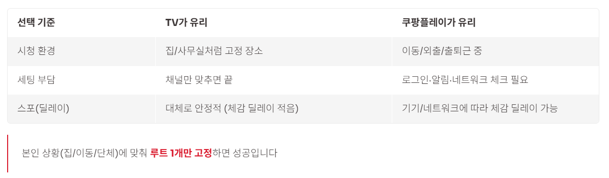 요약: 오늘 “TV vs 쿠팡플레이” 중 1개만 고정하면, 내일은 실수할 구간이 사라집니다.