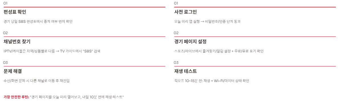 - 경기 당일 SBS 편성표에서 중계 여부를 먼저 확인