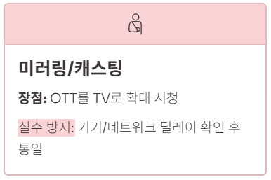 | 미러링/캐스팅 | OTT를 TV로 확대 시청 | 기기/네트워크에 따라 딜레이(지연) 확인 후 통일 |