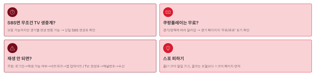 - 최종 확인 1순위: 경기 당일 방송사(예: SBS) 편성표 / 쿠팡플레이 경기 페이지