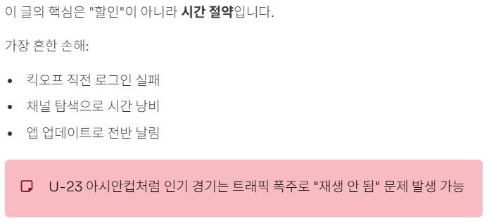 | 재생 안정성 | 로그인 완료, 네트워크 점검 | 킥오프 10~15분 전 재생 테스트 |