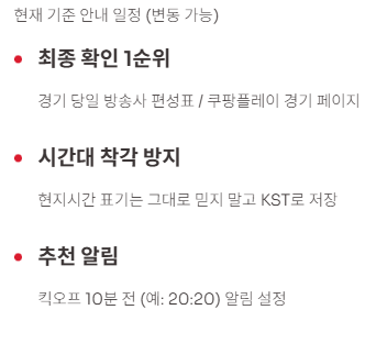 | 경기 시간 | KST로 캘린더 저장 + 10분 전 알림 | 편성표/경기 페이지에서 최종 시간 확인 |