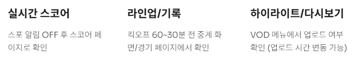 - 실시간 스코어: 스포 알림 OFF 후 스코어 페이지로 확인