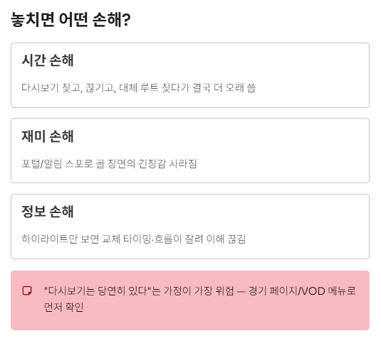 - 기대 손해: “당연히 다시보기 있겠지” 했는데 업로드가 늦거나 없을 수도 있음