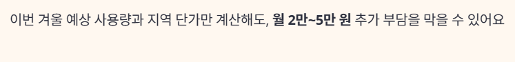 - 겨울에는 난방 사용량이 평소의 2~3배까지 늘어나기 때문에, 같은 단가라도 사용량 구간에 따라 요금이 급격히 증가할 수 있습니다.