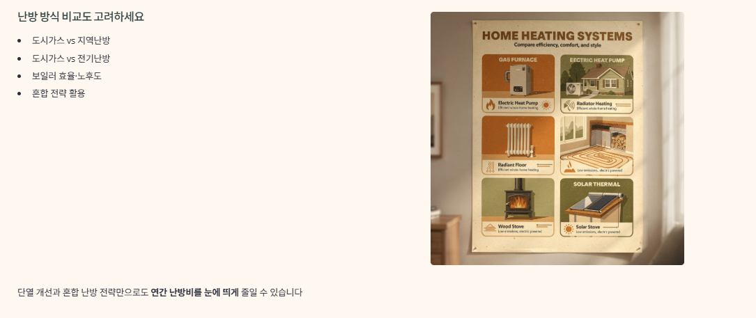 도시가스만 믿고 난방을 쓰다 보면, 우리 집 구조와 생활 패턴에는 전기·지역난방·혼합 전략이 더 유리한데도 몇 년씩 비싼 선택을 이어 가는 경우가 많습니다.