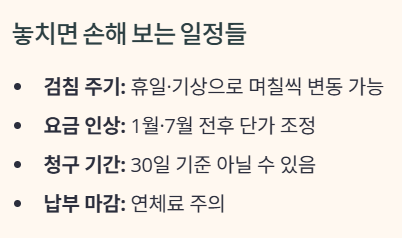 - 납부 마감일: 마감일을 놓치면 연체료가 붙을 수 있고, 두세 달 연속 지연되면 공급 중단·분할 납부 안내를 받게 될 수 있습니다.