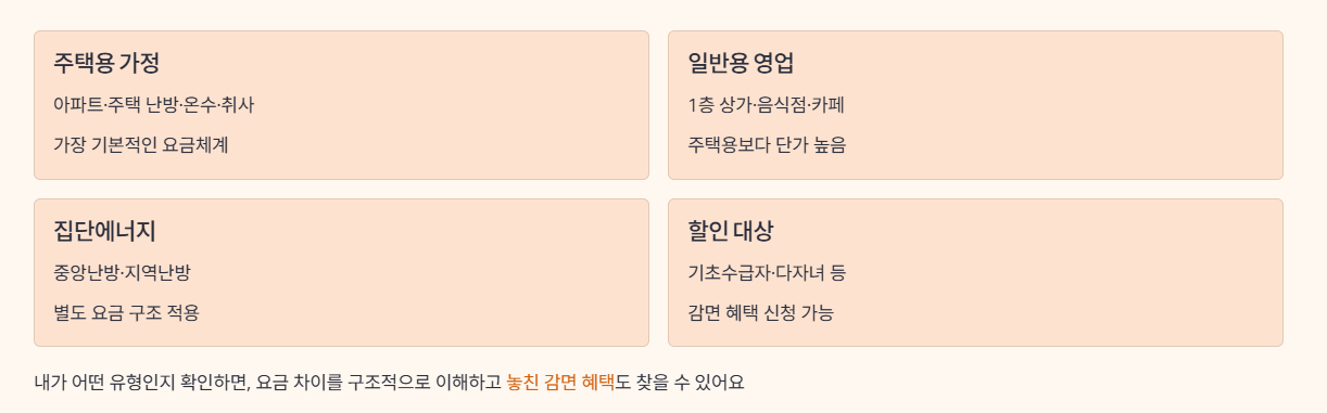 내가 어떤 유형에 속하는지 먼저 확인해 두면, 비슷한 평수인데도 요금 차이가 나는 이유를 구조적으로 설명할 수 있고, 받을 수 있는 감면을 놓치는 실수도 줄일 수 있습니다.