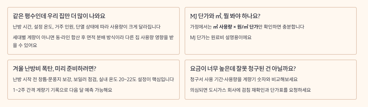 - Q. 겨울 난방비 폭탄을 피하려면 언제부터 무엇을 준비해야 하나요? A. 본격적인 난방 시즌이 시작되기 전, 창틈·문풍지 보강과 보일러 점검, 적정 실내 온도(20~22도) 설정만 해도 사용량을 크게 줄일 수 있습니다. 난방이 시작된 뒤에는 1~2주 간격으로 계량기 사용량을 기록해 두면, 다음 달 청구액을 예측하고 미리 난방 패턴을 조절할 수 있습니다.