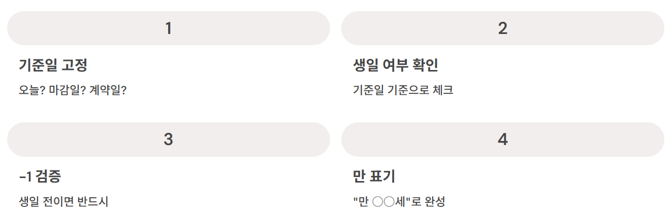 실수 방지 공식은 하나: 기준일 고정 → 생일 전이면 -1 → 결과는 “만 ○○세”.