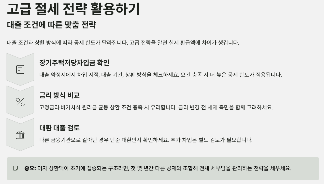 주택담보대출 이자 공제는 대출 조건에 따라 공제 한도와 유리한 선택지가 달라져, 몇 가지 고급 전략을 알고 있으면 실제 환급액에 차이가 날 수 있습니다.