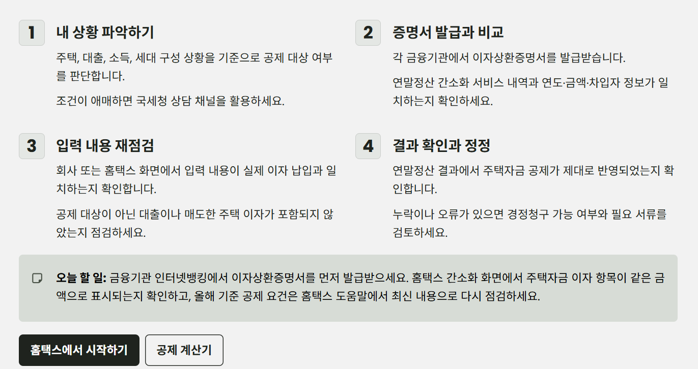 - 회사·홈택스 연말정산 화면에서 주택자금 관련 항목 입력 내용이 실제 이자 납입 내역과 일치하는지, 공제 대상이 아닌 대출이나 이미 매도한 주택 이자가 포함되어 있지는 않은지 다시 점검합니다.