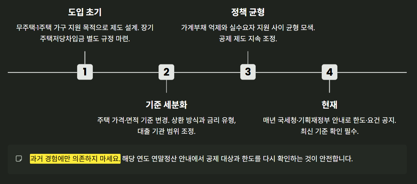 - 금리 수준과 가계부채 증가가 사회적 이슈가 되면서, 과도한 차입을 억제하는 방향과 실수요자 지원을 강화하는 방향 사이에서 공제 제도가 균형을 맞추려는 움직임이 반복되고 있습니다.