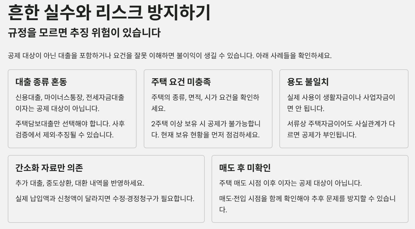 특히 공제 대상이 아닌 대출을 함께 넣거나, 주택·차입자 요건을 제대로 확인하지 않는 경우에 이러한 실수가 자주 발생합니다.