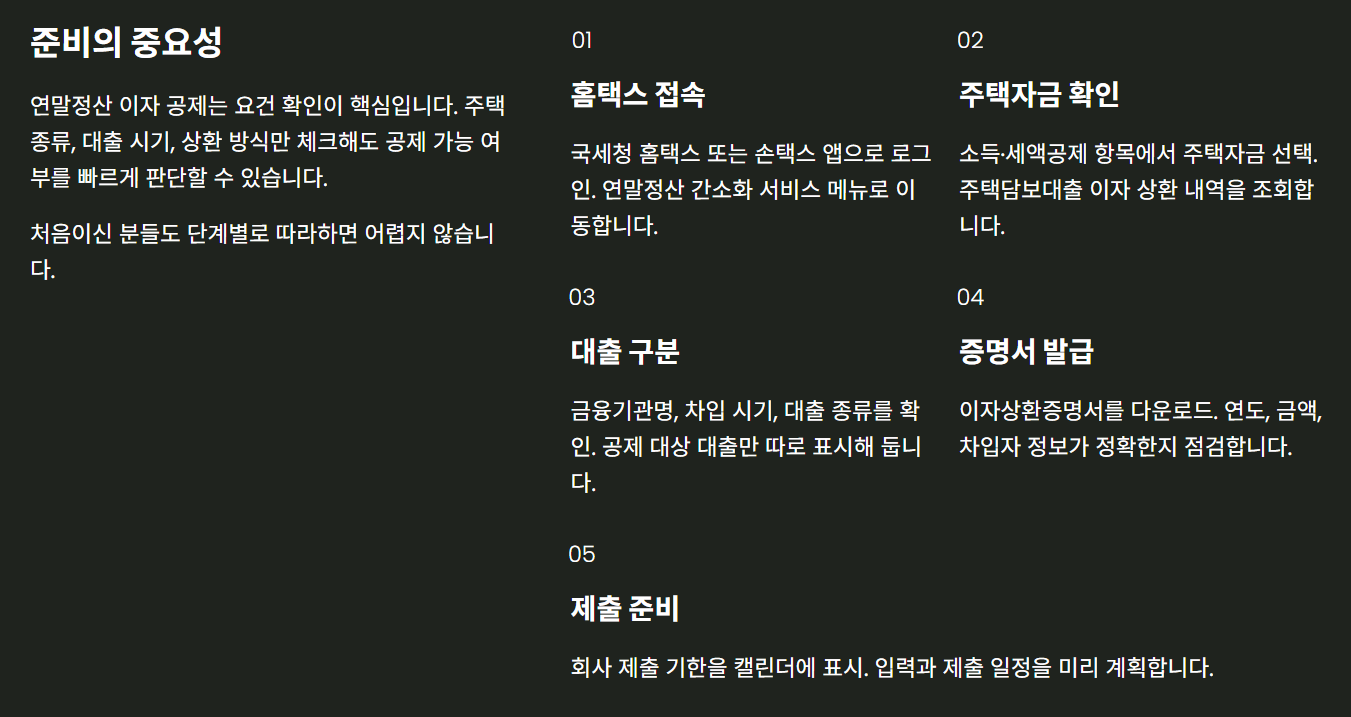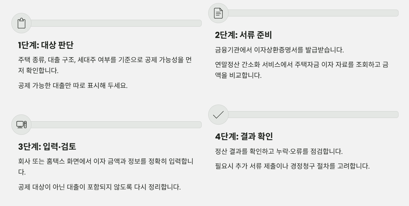 지금까지 내용을 연말정산 실무 흐름만 놓고 보면, 주택담보대출 이자 공제는 생각보다 단순한 네 단계로 정리할 수 있습니다.