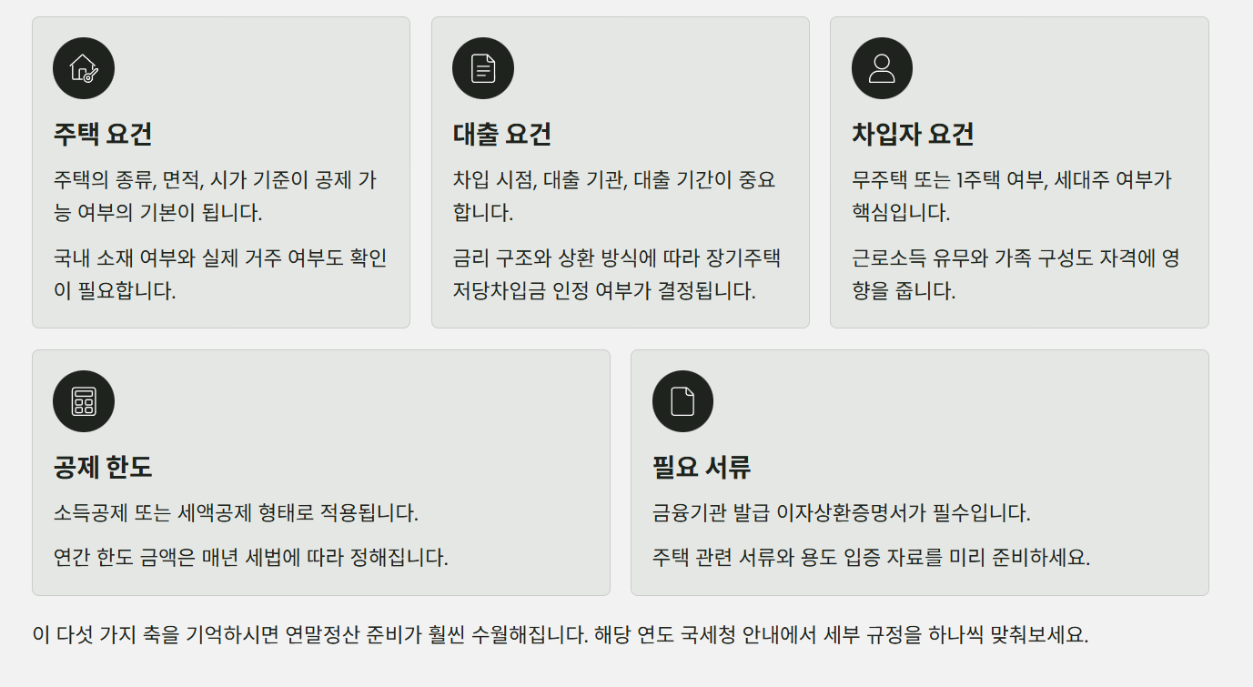 - 주택 요건: 주택의 종류·면적·시가 기준, 국내 소재 여부, 실제 거주 여부 등이 공제 가능 여부의 기본 바탕이 되며, 일정 가격을 넘는 고가 주택은 일부 제한을 받을 수 있습니다.