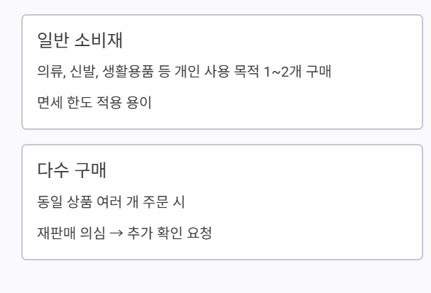 - 여러 개를 한 번에 주문하는 경우: 같은 상품을 여러 개 사면 재판매 목적으로 볼 수 있어 세관에서 추가 확인을 요청할 수 있습니다.