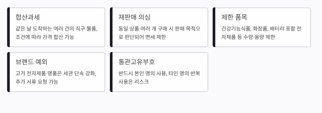 - 제한 품목: 건강기능식품, 식품, 화장품, 배터리가 포함된 전자제품 등은 수량·용량에 별도 제한이 있을 수 있어 사전에 확인이 필요합니다.