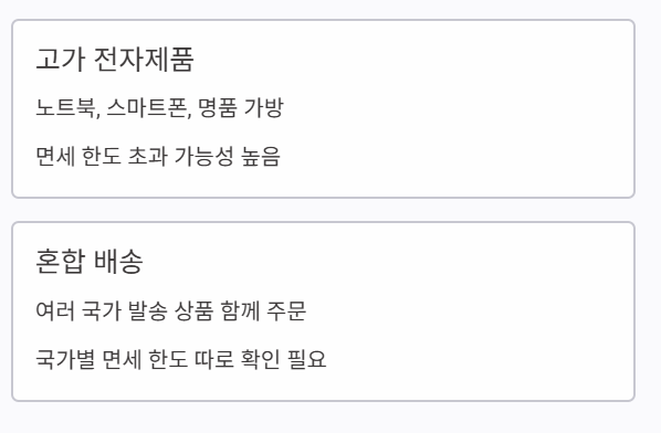 - 미국 외 국가에서 함께 배송되는 경우: 장바구니는 하나라도 실제 발송국이 섞여 있으면, 국가별 면세 한도와 합산 여부를 따로 확인해야 합니다.