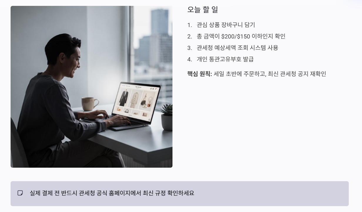 - 합산과세·제한 품목·고가 전자제품 등 추가 리스크가 있는 부분은 관세청 예상세액 조회와 상담으로 한 번 더 확인합니다.