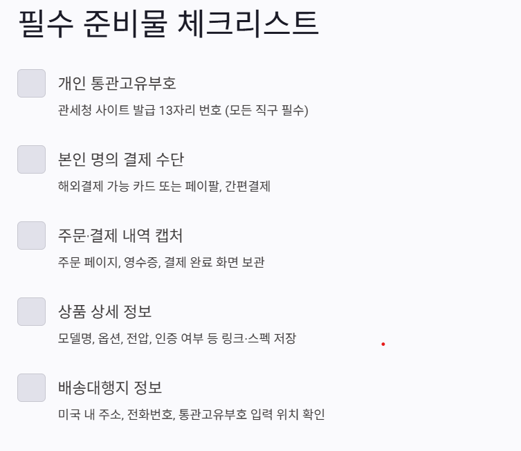- 주문·결제 내역 캡처: 세관에서 증빙을 요구할 수 있으므로, 주문 페이지·영수증·결제 완료 화면을 캡처해 보관하는 것이 좋습니다.