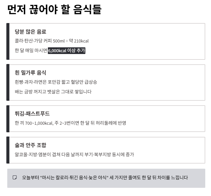 지금 당장 몇 가지만 끊거나 줄여도, 한 달 기준 수천 kcal를 줄여 복부지방이 붙을 여유를 크게 줄일 수 있습니다.