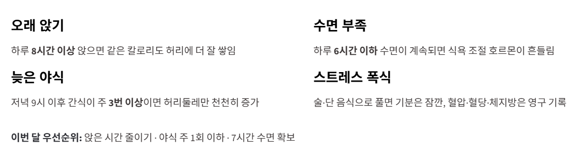 - 하루 8시간 이상 앉아서 일하거나 쉬면, 같은 칼로리를 먹어도 허리 주변에 지방이 더 잘 쌓입니다.